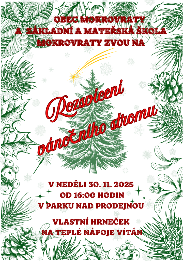 Obec Mokrovraty zve na slavnostní rozsvícení vánočního stromu v neděli 30. 11. 2025.